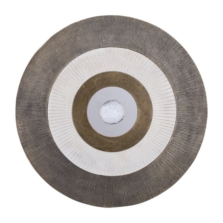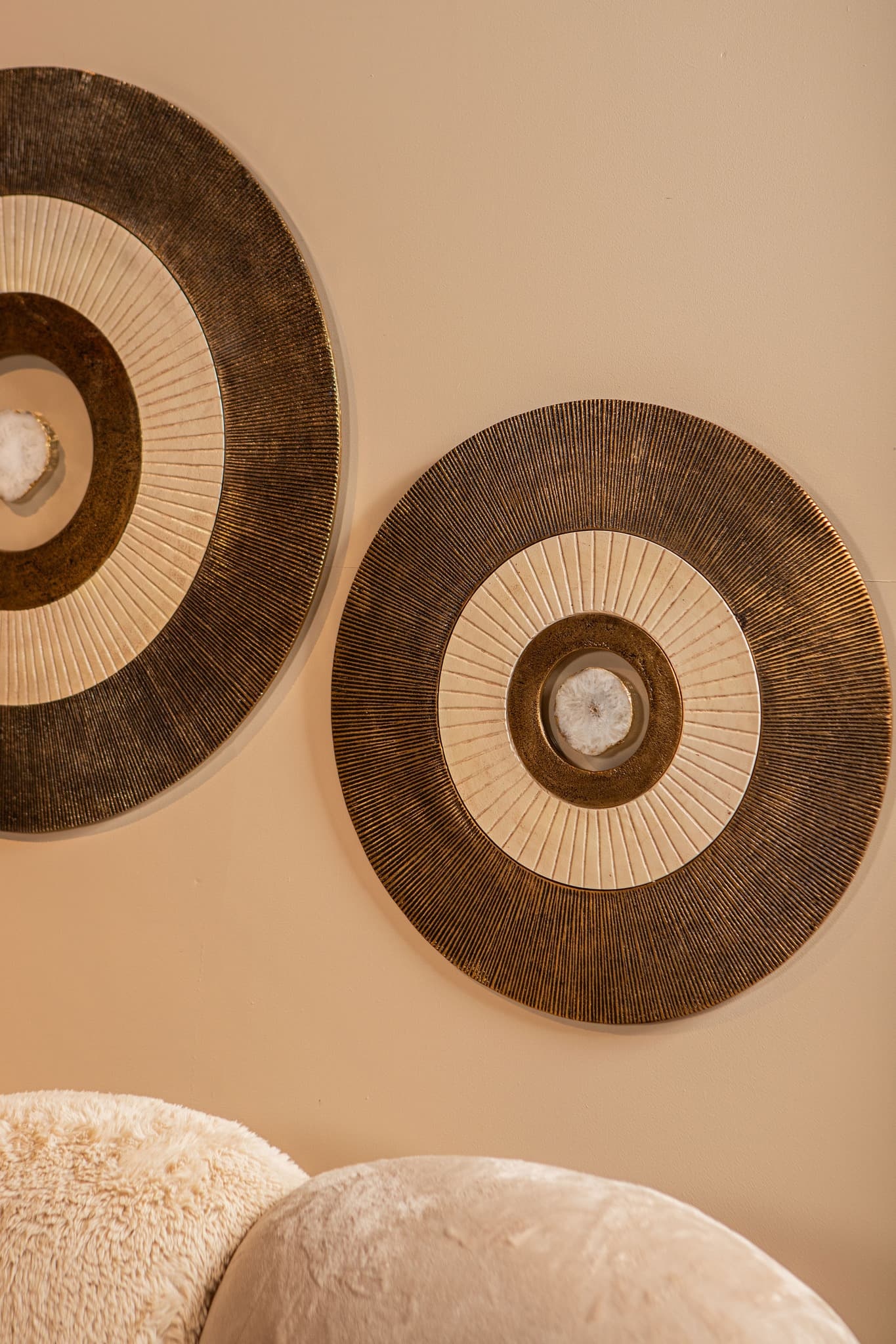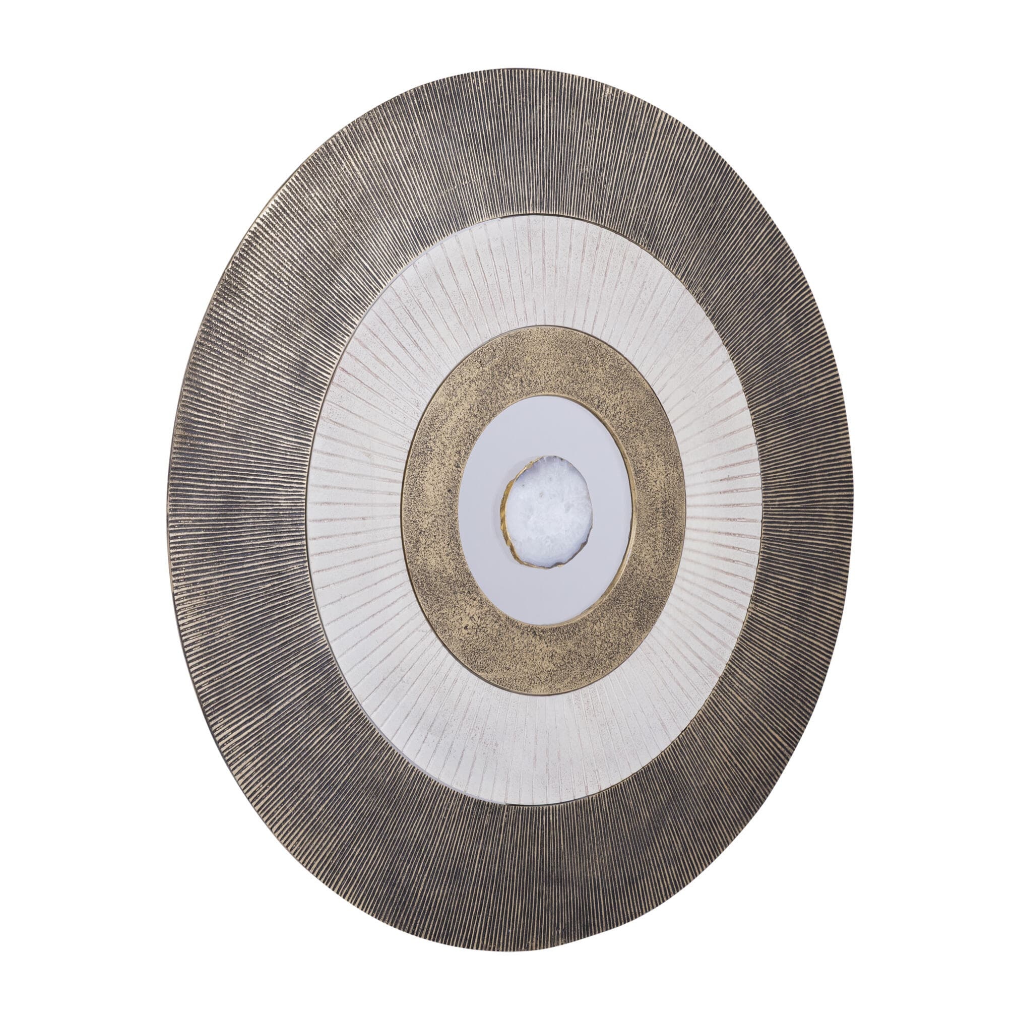 Voeg exclusieve luxe toe aan je wand met het ronde PTMD Jacci Gold Wandpaneel Small. Dit handgemaakte kunstwerk van 59,5 cm combineert goudkleurig gegoten aluminium met een center stone hart van natuursteen.