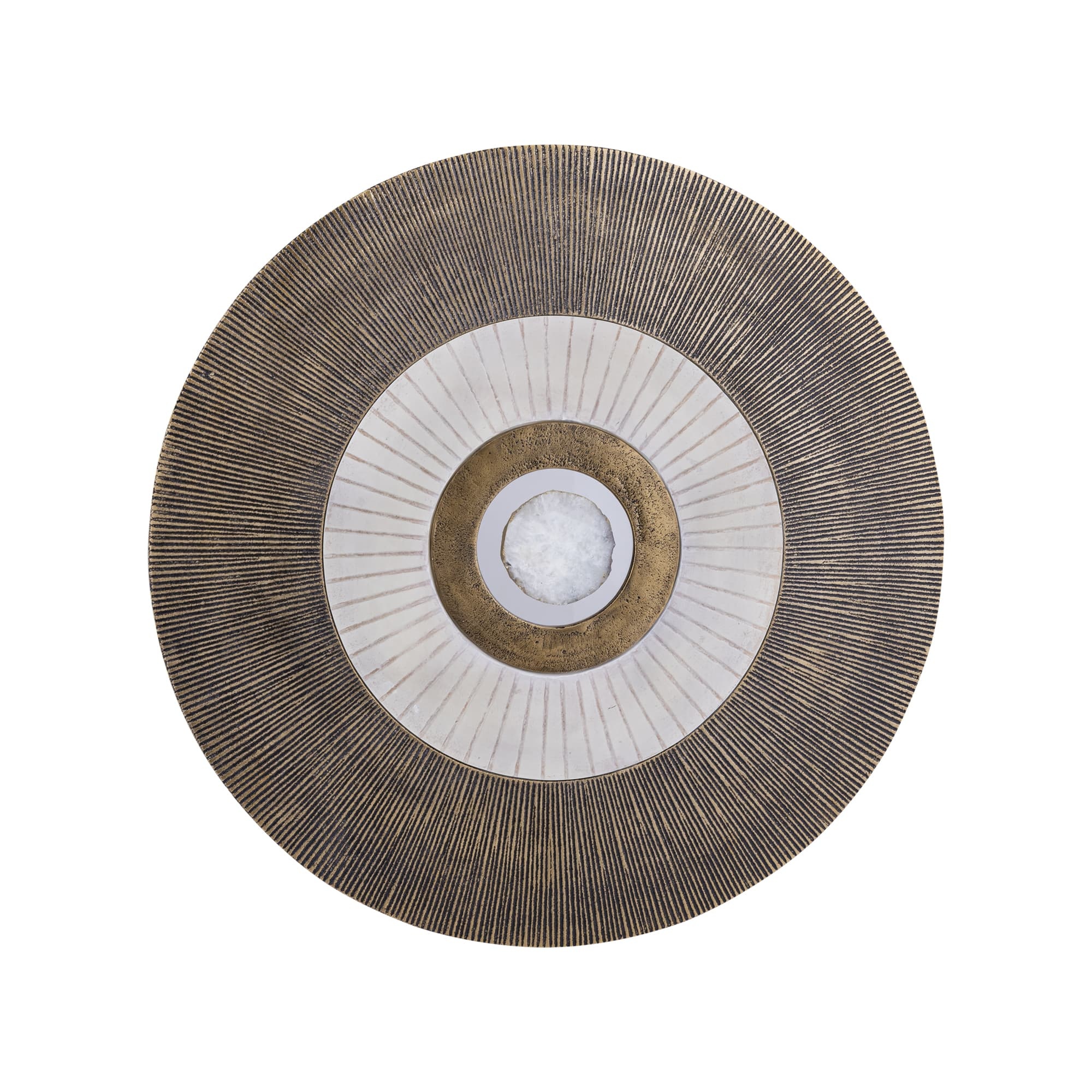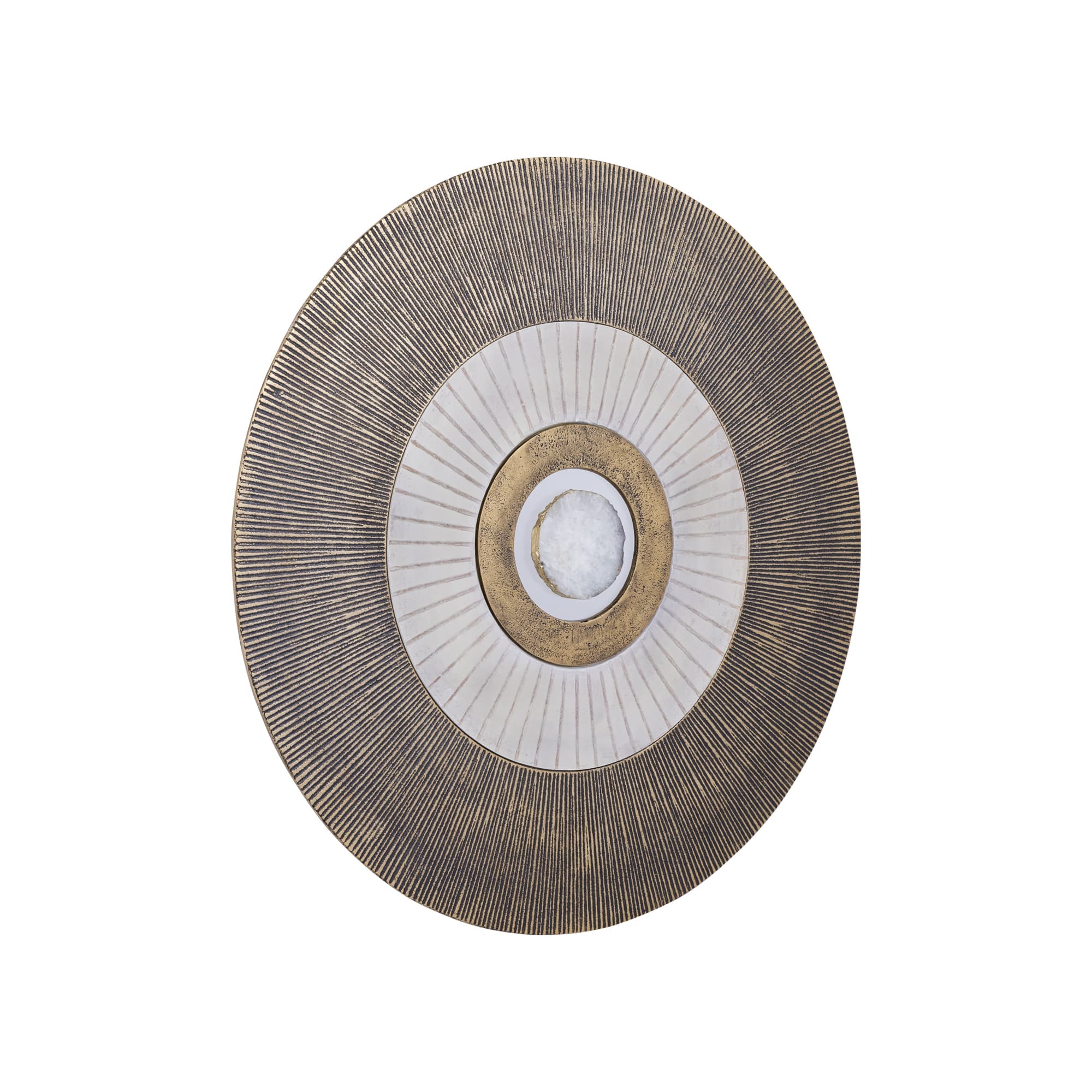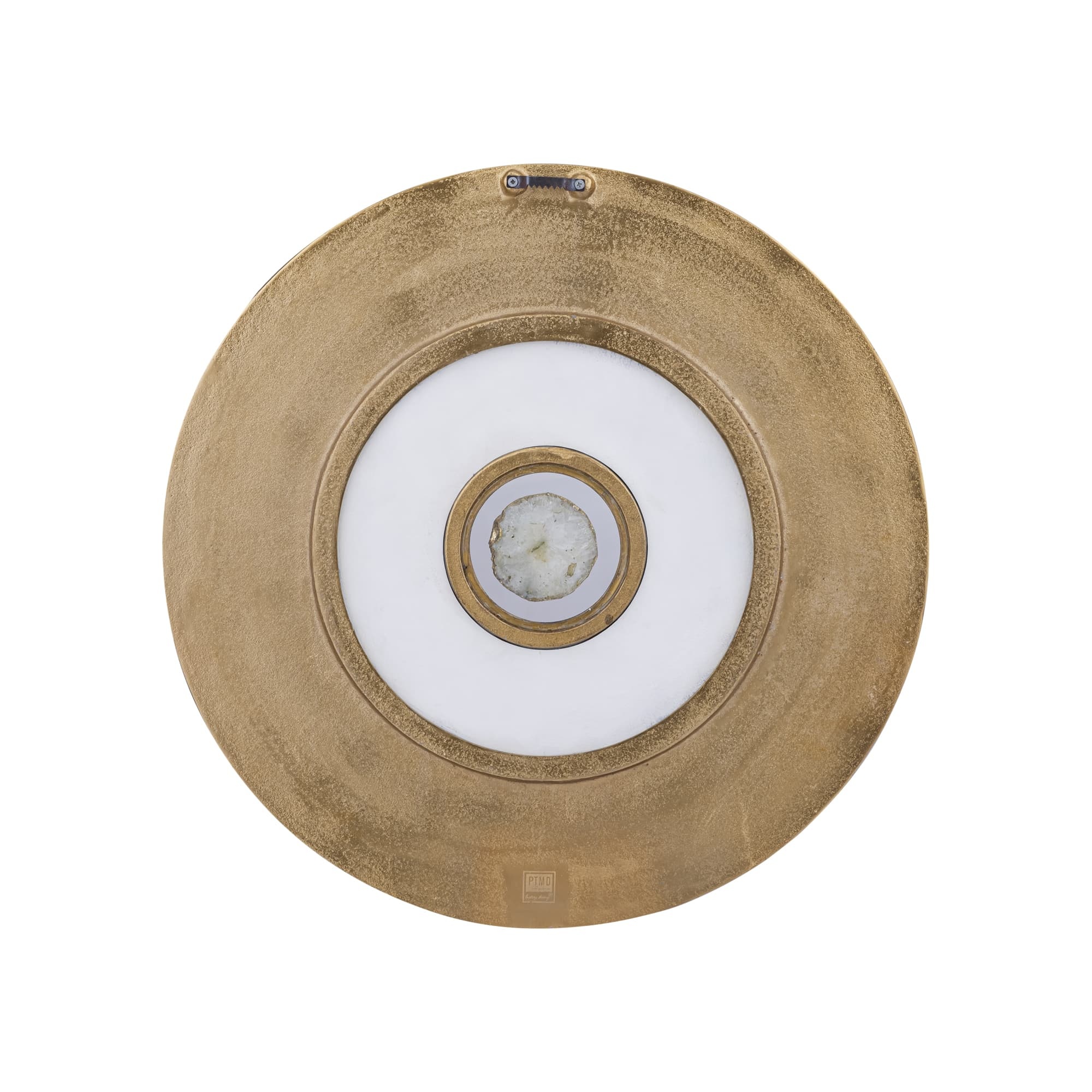 Haal een luxe statement in huis met het ronde PTMD Jacci Gold Wandpaneel Large. Met een diameter van 82 cm en een uniek hart van natuursteen is dit gouden wandobject van gegoten aluminium een absolute eyecatcher.