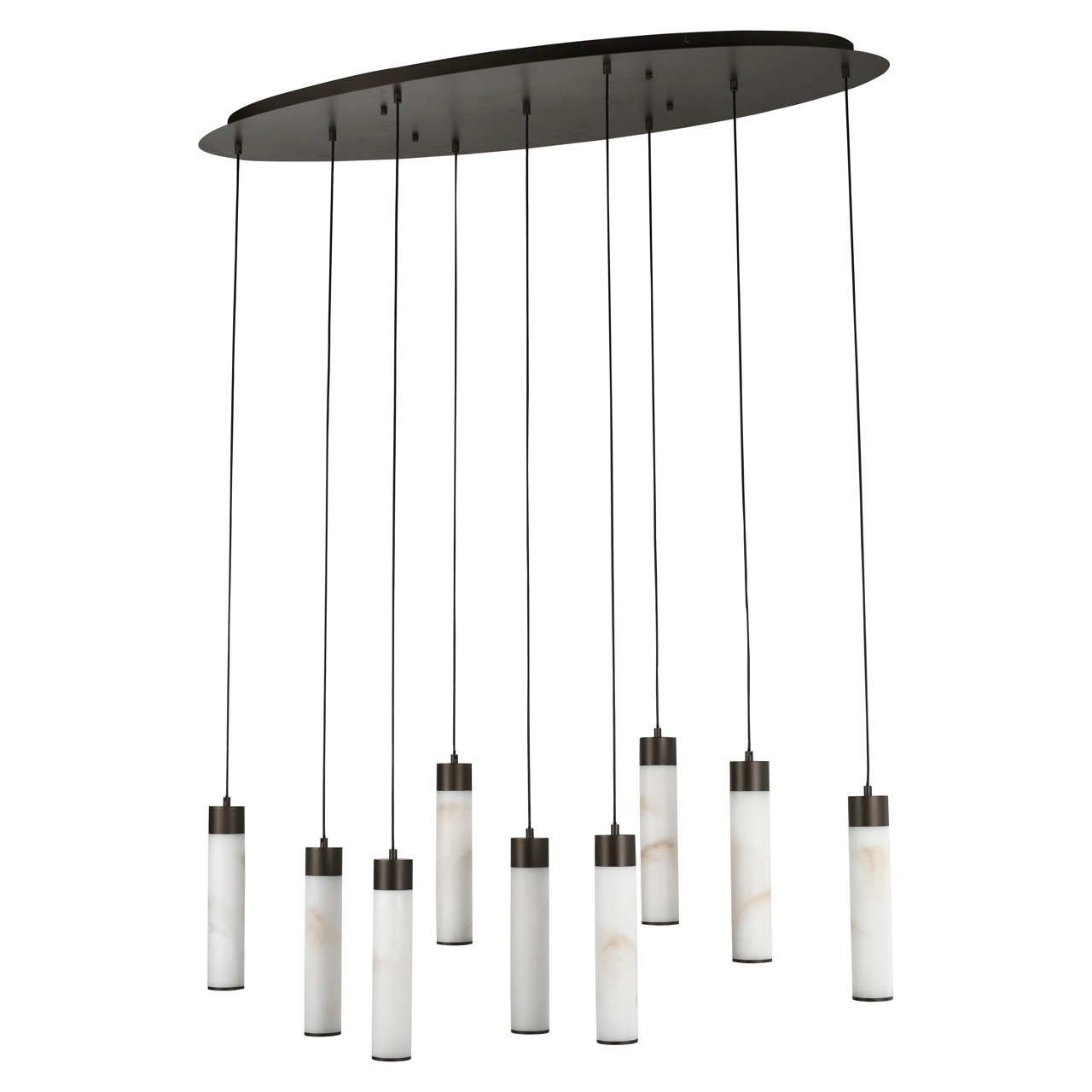 De witte Auralith hanglamp gemaakt van de natuursteen albast combineert een strak en modern silhouet met een elegante afwerking. Het warme licht dat door het albast schijnt, zorgt voor een serene en sfeervolle gloed.