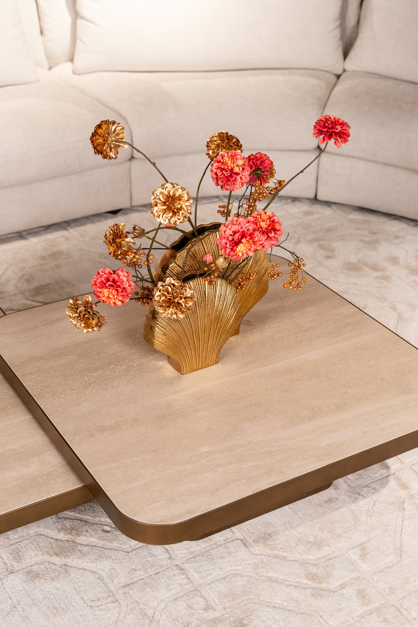 Ontdek de salontafel Claridge Beige cumulus 100x100 cm van Richmond. Een luxe eyecatcher met een travertin-look keramisch blad en een modern design. Perfect voor een Hotel chique interieur. Met een uniek omkeerbaar blad van keramiek en zwart glas.